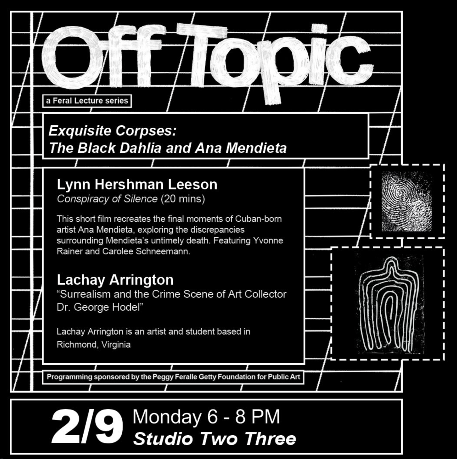 Monday, February 9th, 6:00 pm at Studio Two Three | We will screen Lynn Hershman Leeson’s short film, Conspiracy of Silence, on the subject of the artist Ana Mendieta’s untimely death. This will be followed by a lecture on the link between the early 20th-century surrealist movement and the unsolved Black Dahlia murder, delivered by artist and researcher Lachay Arrington.